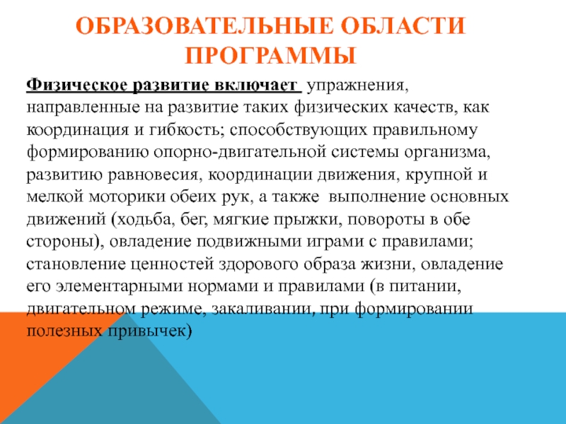 качеств, как координация и гибкость; способствующих правильному формированию опорно-двигательной системы организма, развитию равновесия, координации движения, крупной и мелкой моторики обеих рук, а также выполнение основных движений (ходьба, бег, мягкие прыжки, повороты в обе стороны), овладение подвижными играми с правилами; становление ценностей здорового образа жизни, овладение его элементарными нормами и правилами (в питании, двигательном режиме, закаливании, при формировании полезных привычек)