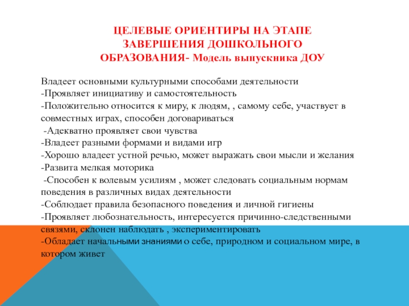 Слайд 23ЦЕЛЕВЫЕ ОРИЕНТИРЫ НА ЭТАПЕ ЗАВЕРШЕНИЯ ДОШКОЛЬНОГО ОБРАЗОВАНИЯ- Модель выпускника ДОУ