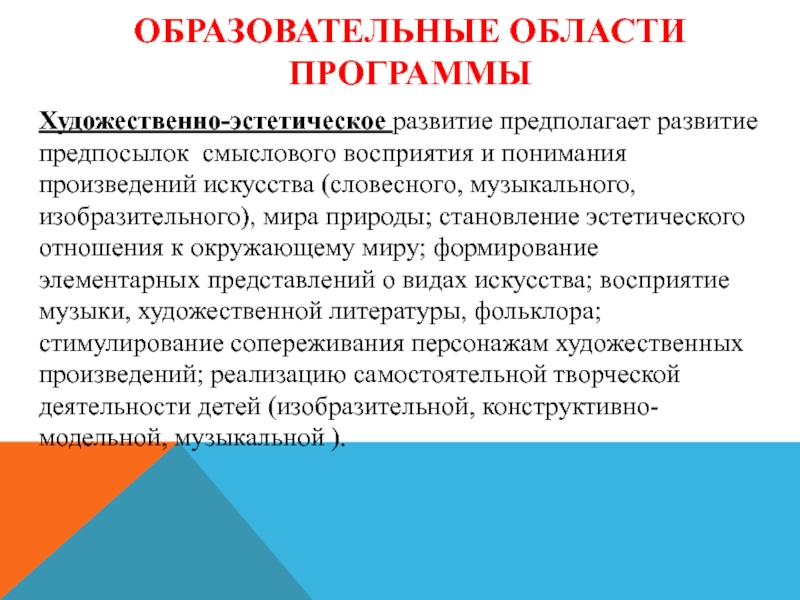 произведений искусства (словесного, музыкального, изобразительного), мира природы; становление эстетического отношения к окружающему миру; формирование элементарных представлений о видах искусства; восприятие музыки, художественной литературы, фольклора; стимулирование сопереживания персонажам художественных произведений; реализацию самостоятельной творческой деятельности детей (изобразительной, конструктивно- модельной, музыкальной ).