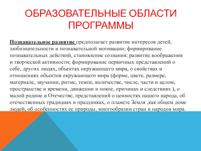 мотивации; формирование познавательных действий, становление сознания; развитие воображения и творческой активности; формирование первичных представлений о себе, других людях, объектах окружающего мира, о свойствах и отношениях объектов окружающего мира (форме, цвете, размере, материале, звучании, ритме, темпе, количестве, числе, части и целом, пространстве и времени, движении и покое, причинах и следствиях ), о малой родине и Отечестве, представлений о ценностях нашего народа, об отечественных традициях и праздниках, о планете Земля ,как общем доме людей, об особенностях ее природы, многообразии стран и народов мира.