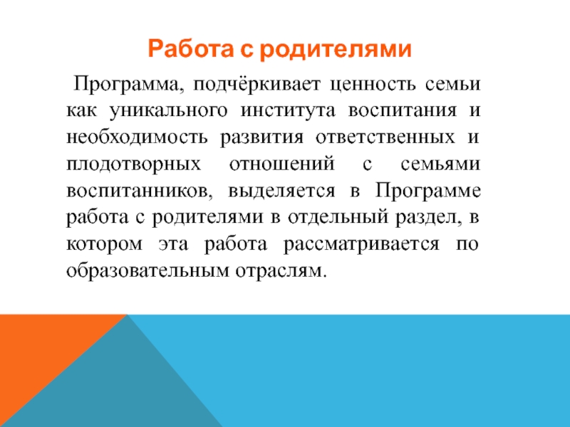 и необходимость развития ответственных и плодотворных отношений с семьями воспитанников, выделяется в Программе работа с родителями в отдельный раздел, в котором эта работа рассматривается по образовательным отраслям.