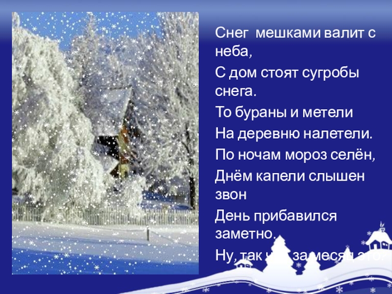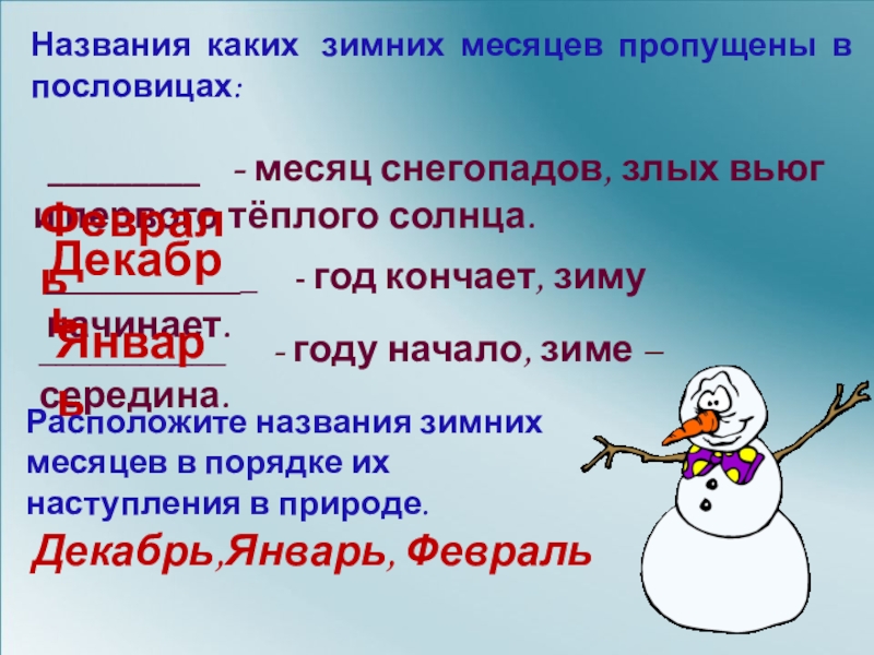 Расположите названия зимних месяцев в порядке их наступления в природе.