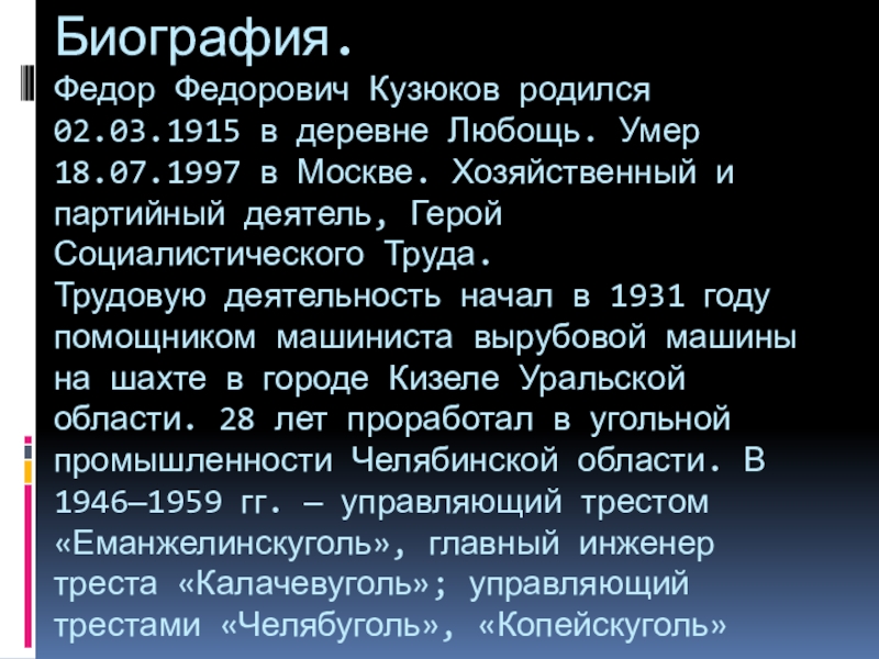 Биография. Федор Федорович Кузюков родился 02.03.1915 в деревне Любощь. Умер 18.07.1997 в Москве. Хозяйственный и партийный деятель, Герой Социалистического Труда. Трудовую деятельность начал в 1931 году помощником машиниста вырубовой машины на шахте в городе Кизеле Уральской