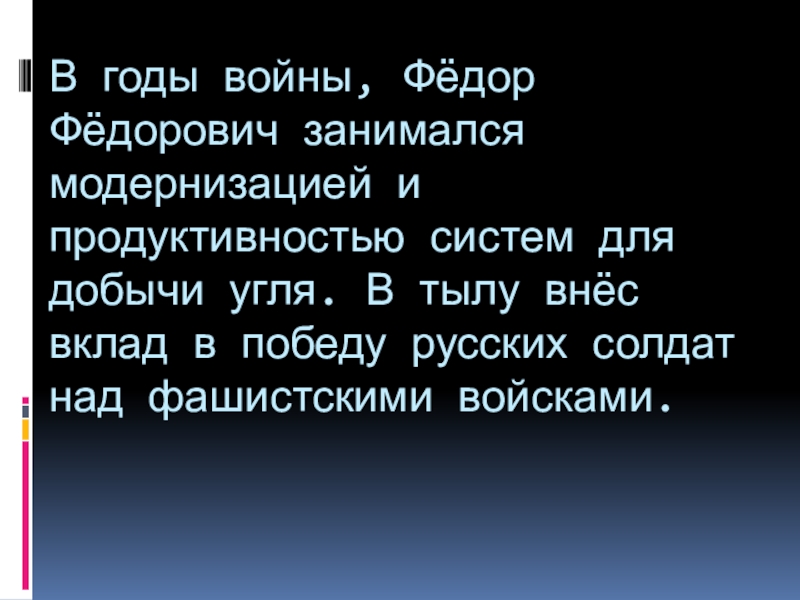 Слайд 4В годы войны, Фёдор Фёдорович занимался модернизацией и продуктивностью систем для