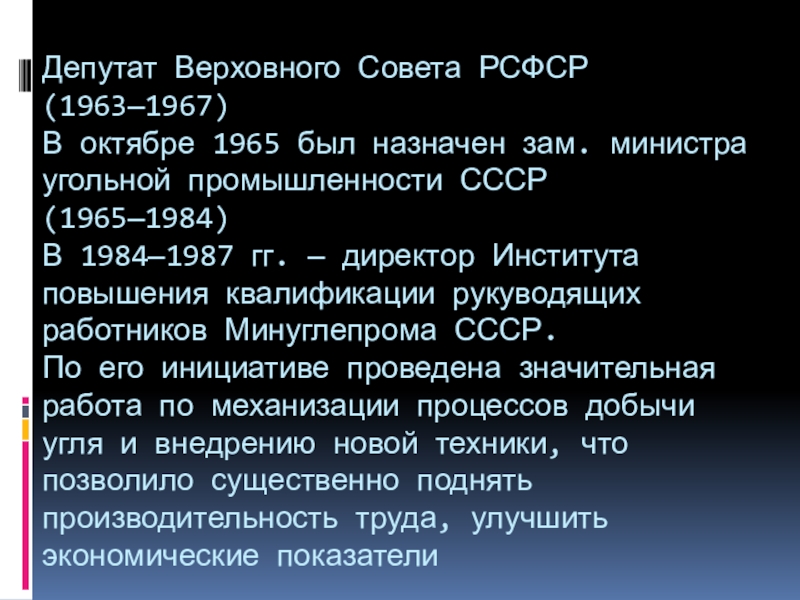 Слайд 3Депутат Верховного Совета РСФСР (1963—1967) В октябре 1965 был назначен зам. министра