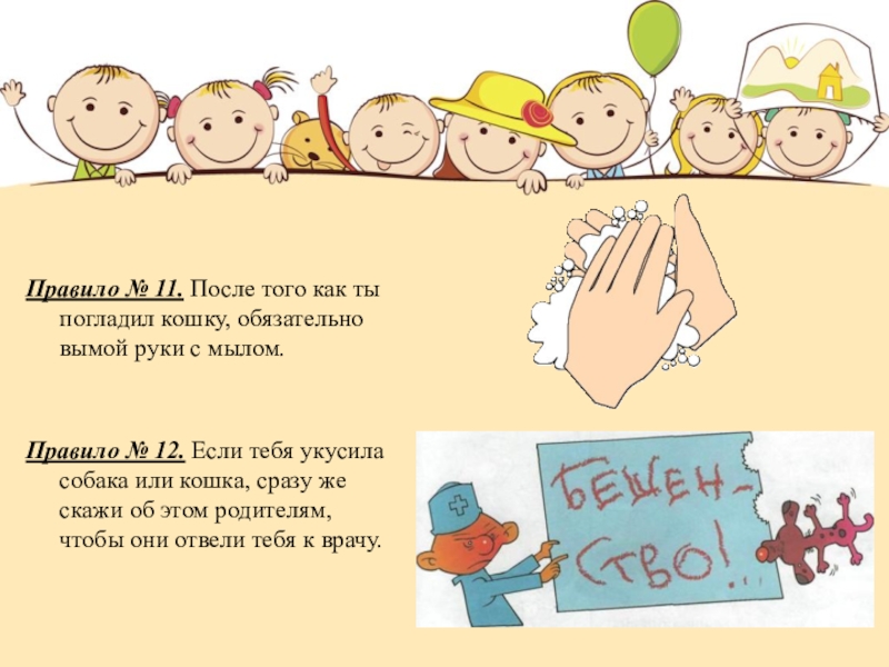 Правило № 11. После того как ты погладил кошку, обязательно вымой руки с мылом.Правило № 12. Если