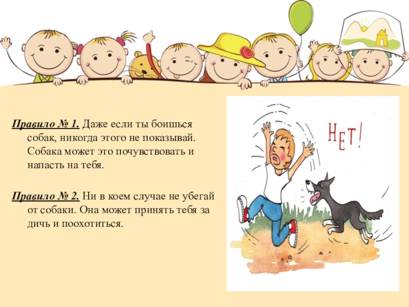 Правило № 1. Даже если ты боишься собак, никогда этого не показывай. Собака может это почувствовать и напасть на тебя.Правило № 2. Ни в коем случае не убегай от собаки. Она может принять тебя за дичь
