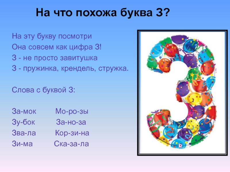 На что похожа буква З?На эту букву посмотриОна совсем как цифра З!З - не просто завитушкаЗ -