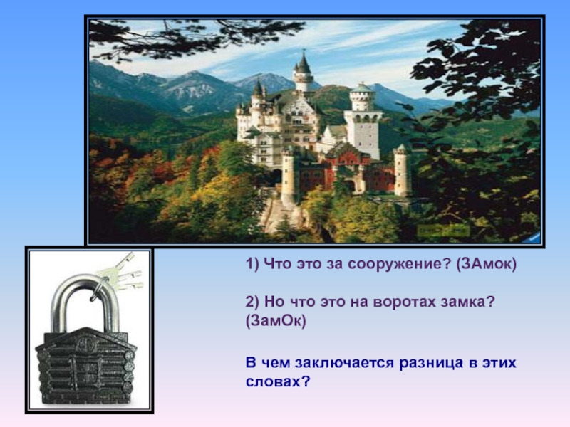 1) Что это за сооружение? (ЗАмок)2) Но что это на воротах замка? (ЗамОк)В чем заключается разница в