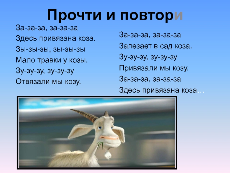 Прочти и повториЗа-за-за, за-за-заЗдесь привязана коза.Зы-зы-зы, зы-зы-зыМало травки у козы.Зу-зу-зу, зу-зу-зуОтвязали мы козу.За-за-за, за-за-заЗалезает в сад коза.Зу-зу-зу,