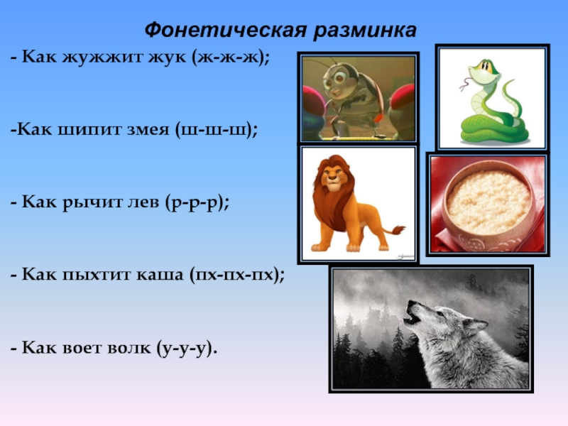 Фонетическая разминка- Как жужжит жук (ж-ж-ж);-Как шипит змея (ш-ш-ш);- Как рычит лев (р-р-р);- Как пыхтит каша (пх-пх-пх);- Как воет волк (у-у-у).