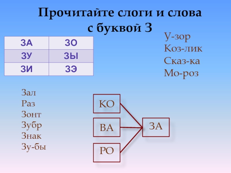 Прочитайте слоги и слова с буквой ЗЗалРазЗонтЗубрЗнакЗу-быКОВАРОЗАУ-зорКоз-ликСказ-каМо-роз
