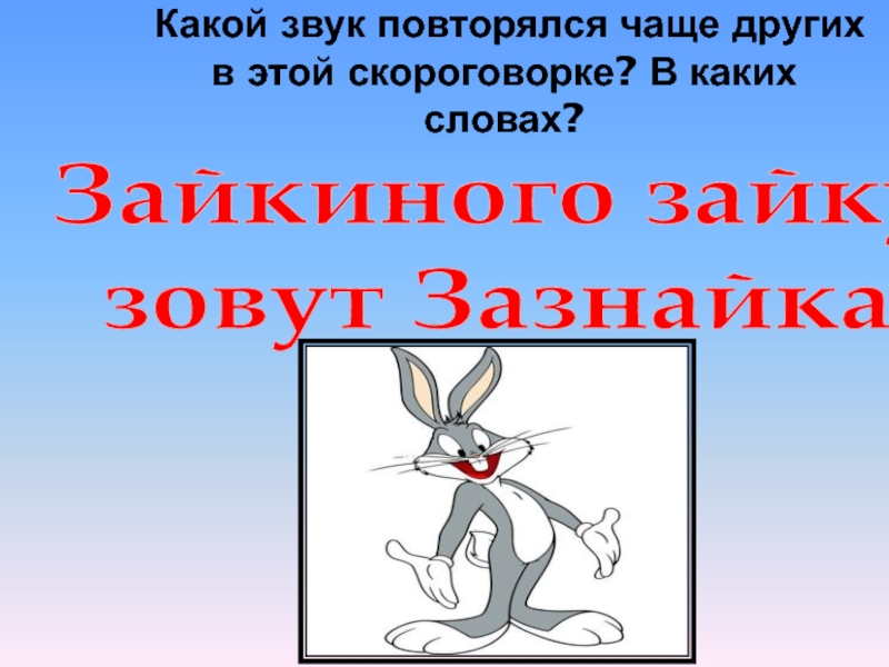 Какой звук повторялся чаще других в этой скороговорке? В каких словах?Зайкиного зайку зовут Зазнайка