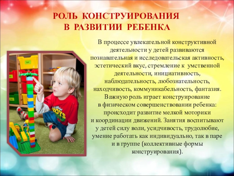 осваивать технические приемы работы: накладывать 4-5 кирпичиков или кубиков друг на друга, укладывать кирпичики в ряд большой плоскостью на столе, ставить кирпичики вертикально на меньшую плоскость.