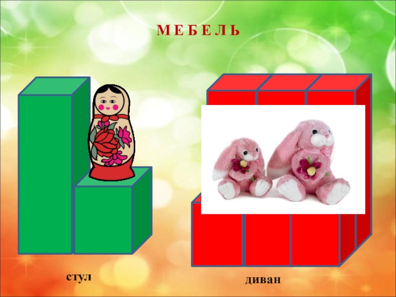при конструировании мебели выделяем части предметов (у стула – спинка и сиденье и т.д.), сначала строим один предмет из мебели, затем несколько;