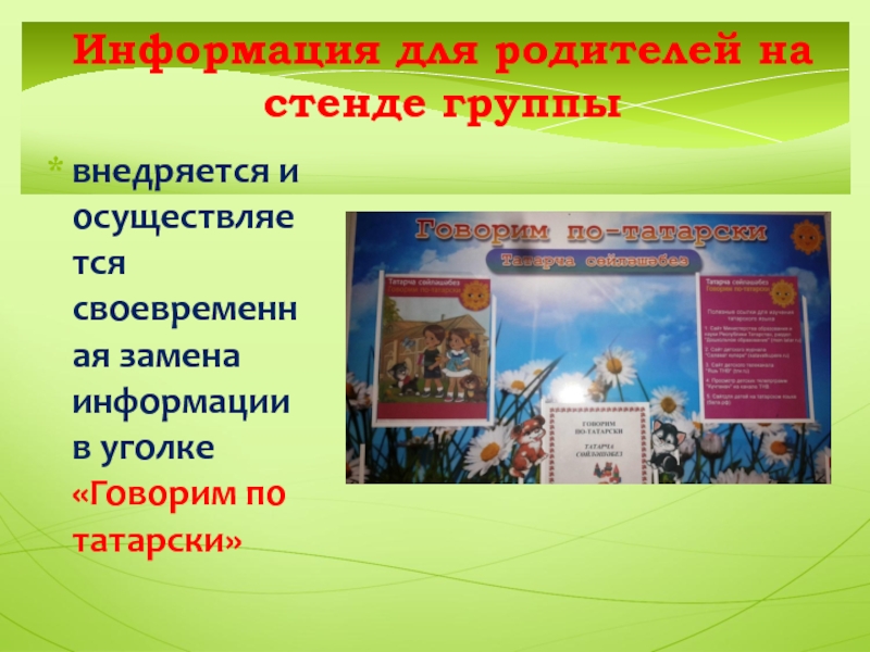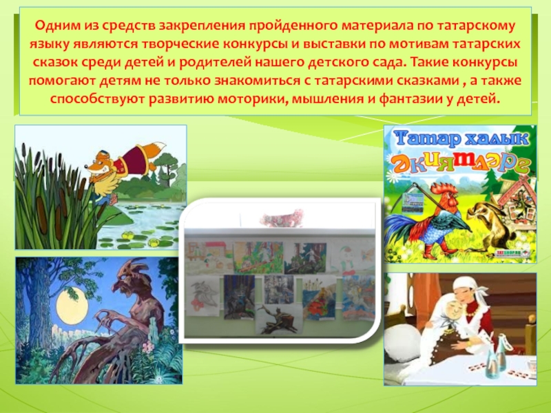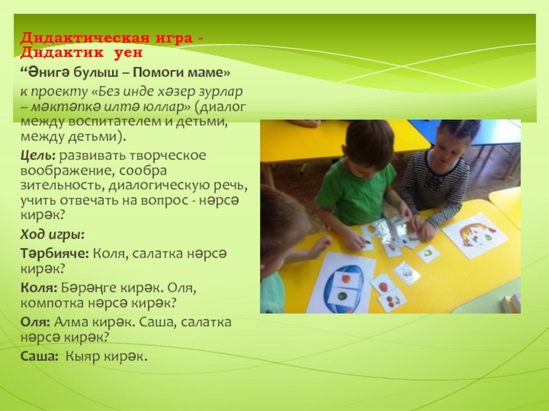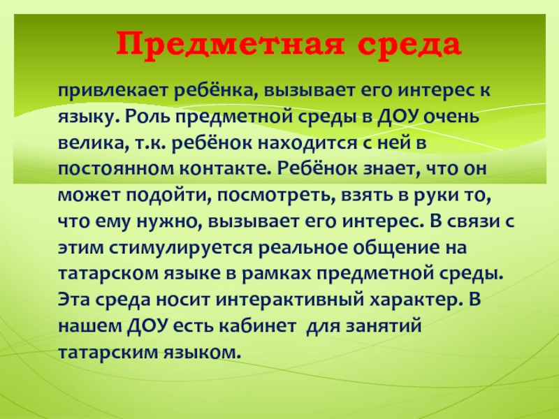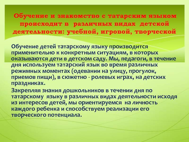Закрепляя знания дошкольников в течении дня по татарскому языку в различных видах деятельности исходя из интересов детей, мы ориентируемся на личность каждого ребенка и способствуем реализации его творческого потенциала.