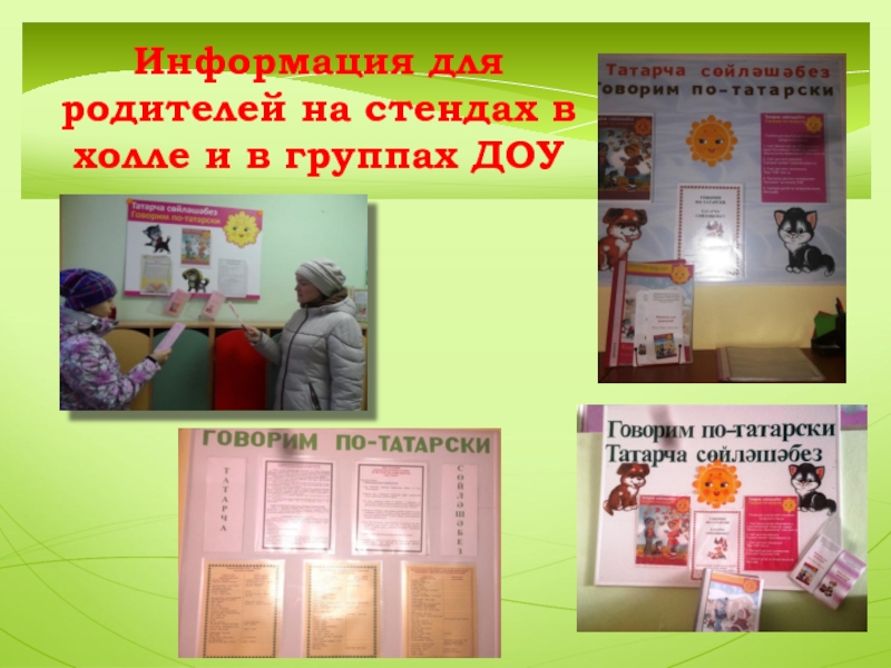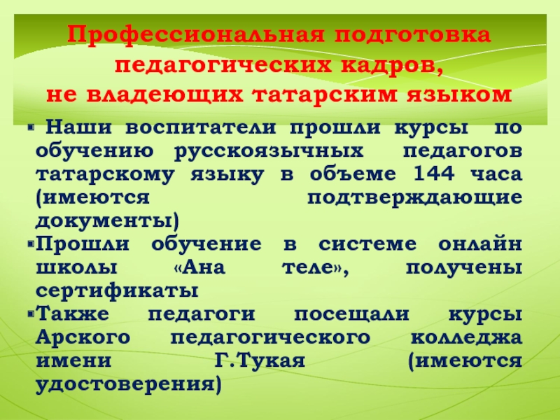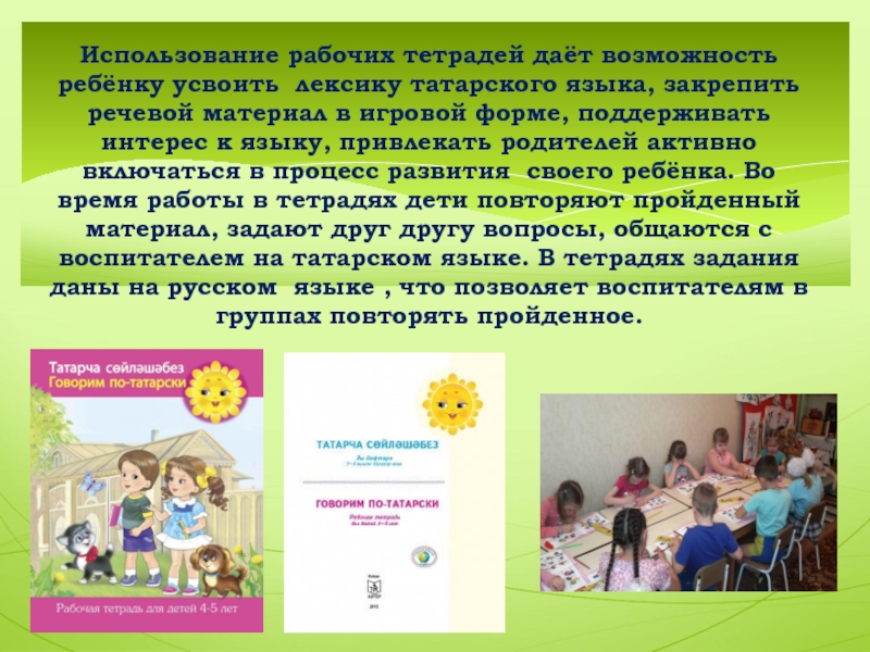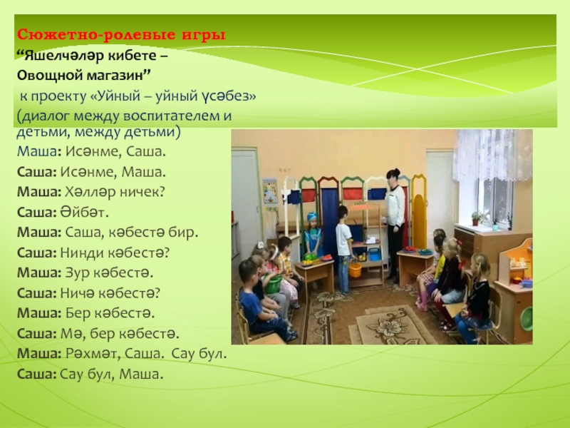 Обучение детей татарскому языку производится применительно к конкретным ситуациям, в которых оказываются дети в детском саду. Мы, педагоги, в течение дня используем татарский язык во время различных режимных моментах (одевании на улицу, прогулок, приемов пищи), в сюжетно - ролевых играх, на детских праздниках.