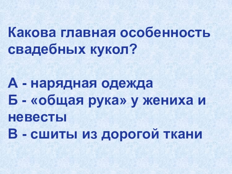Слайд 21Какова главная особенность свадебных кукол?