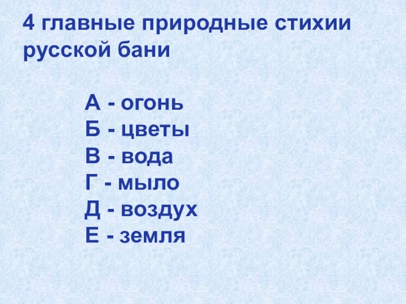Слайд 434 главные природные стихии русской бани