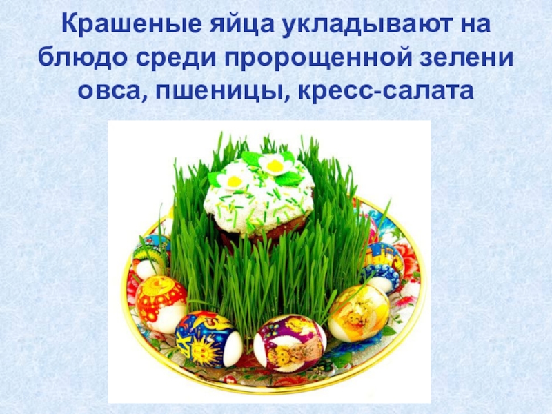 Слайд 26Крашеные яйца укладывают на блюдо среди пророщенной зелени овса, пшеницы, кресс-салата