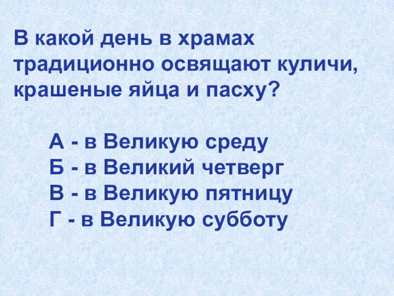 Слайд 23В какой день в храмах традиционно освящают куличи, крашеные яйца и