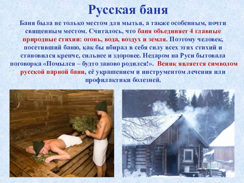 почти священным местом. Считалось, что баня объединяет 4 главные природные стихии: огонь, вода, воздух и земля. Поэтому человек, посетивший баню, как бы вбирал в себя силу всех этих стихий и становился крепче, сильнее и здоровее. Недаром на Руси бытовала поговорка «Помылся – будто заново родился!». Веник является символом русской парной бани, её украшением и инструментом лечения или профилактики болезней.