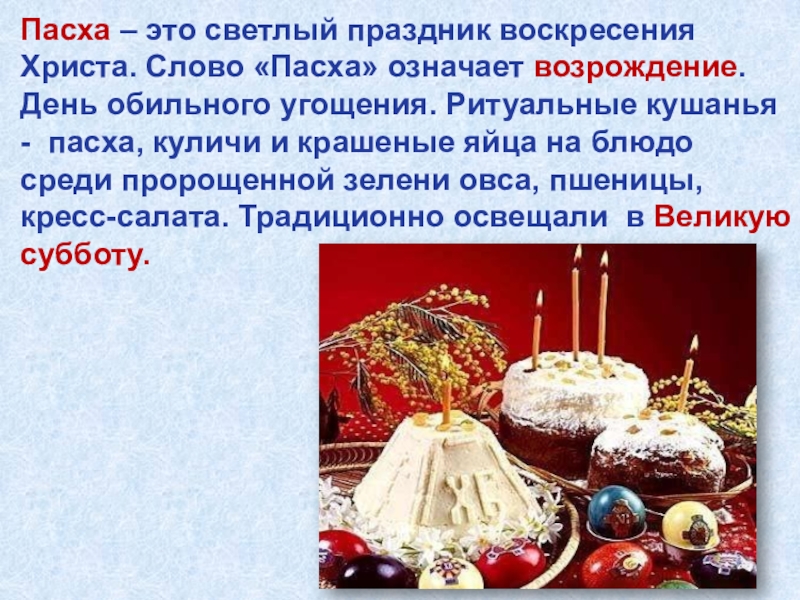 возрождение. День обильного угощения. Ритуальные кушанья - пасха, куличи и крашеные яйца на блюдо среди пророщенной зелени овса, пшеницы, кресс-салата. Традиционно освещали в Великую субботу.