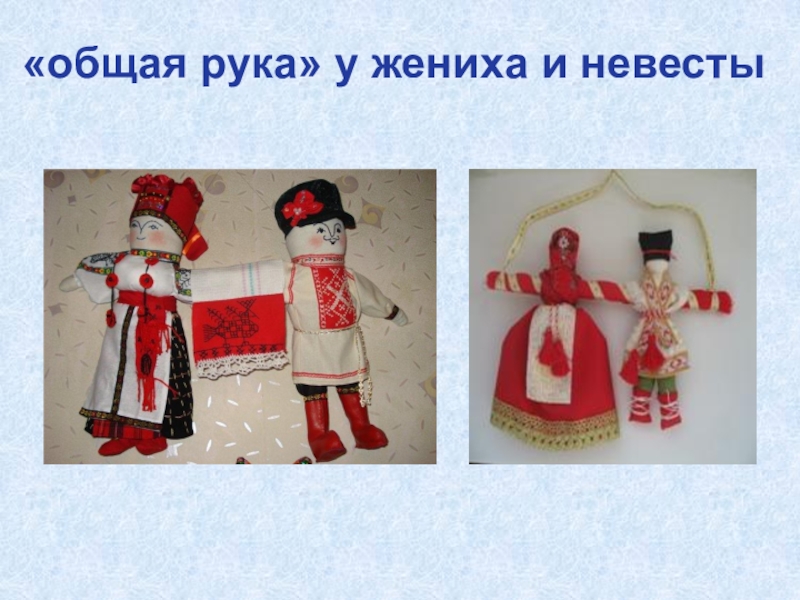 Встреча молодых - караваем и солью, главная особенность свадебных кукол - «общая рука» у жениха и невесты.
