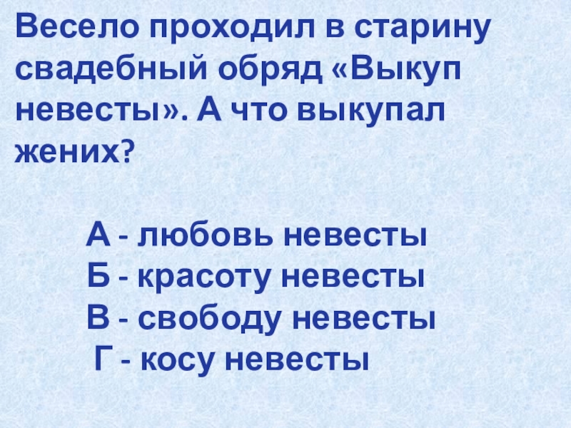 Слайд 19Весело проходил в старину свадебный обряд «Выкуп невесты». А что выкупал