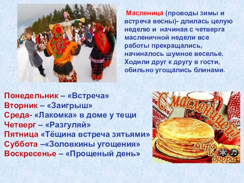 Слайд 7 Масленица (проводы зимы и встреча весны)- длилась целую неделю и