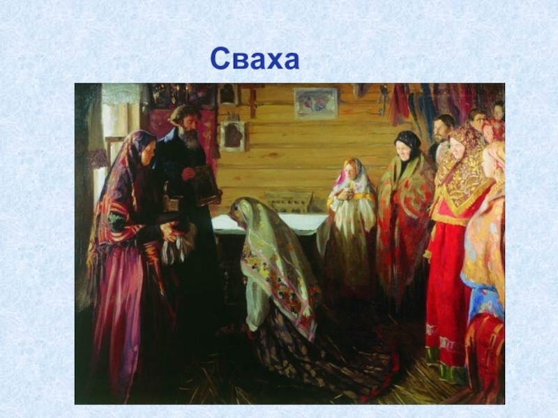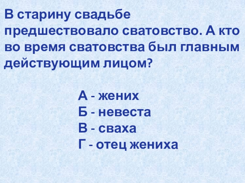 Слайд 17В старину свадьбе предшествовало сватовство. А кто во время сватовства был