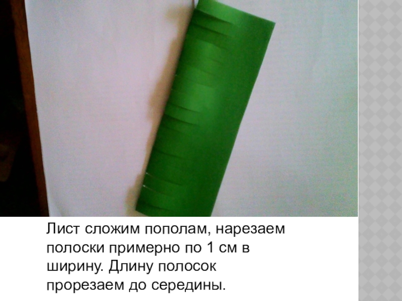 Слайд 4Лист сложим пополам, нарезаем полоски примерно по 1 см в ширину.