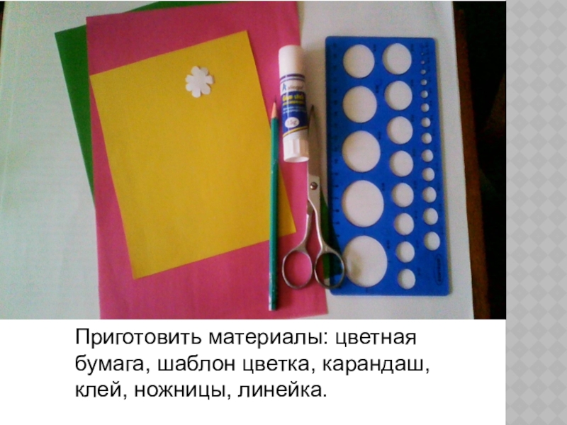 Слайд 2Приготовить материалы: цветная бумага, шаблон цветка, карандаш, клей, ножницы, линейка.