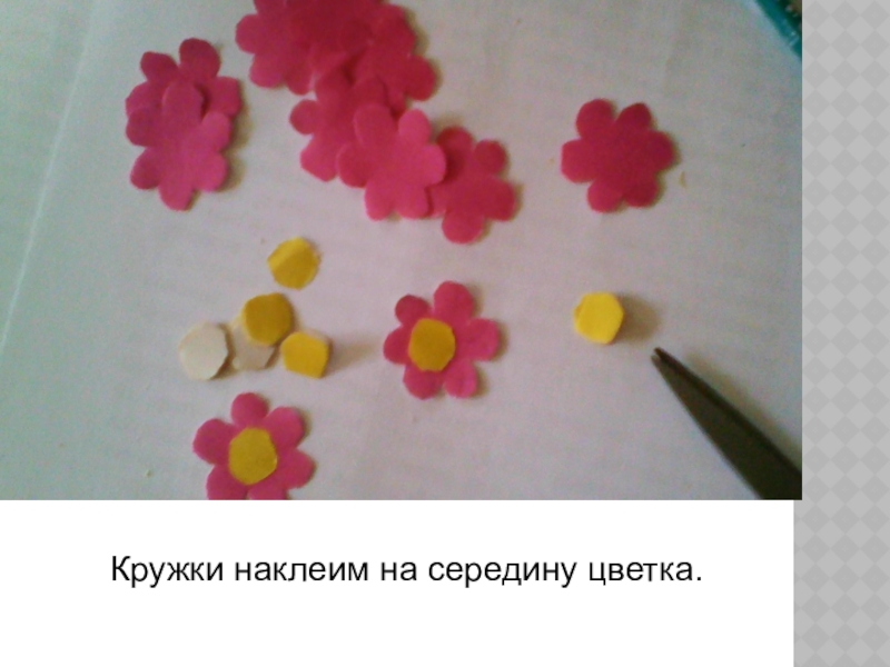 Слайд 11Кружки наклеим на середину цветка.