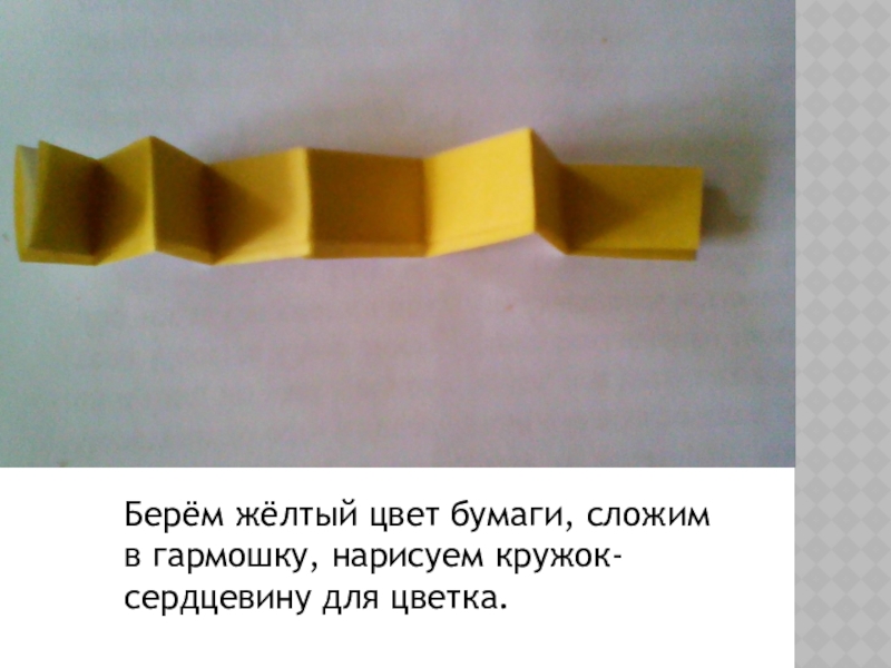 Слайд 9Берём жёлтый цвет бумаги, сложим в гармошку, нарисуем кружок-сердцевину для цветка.
