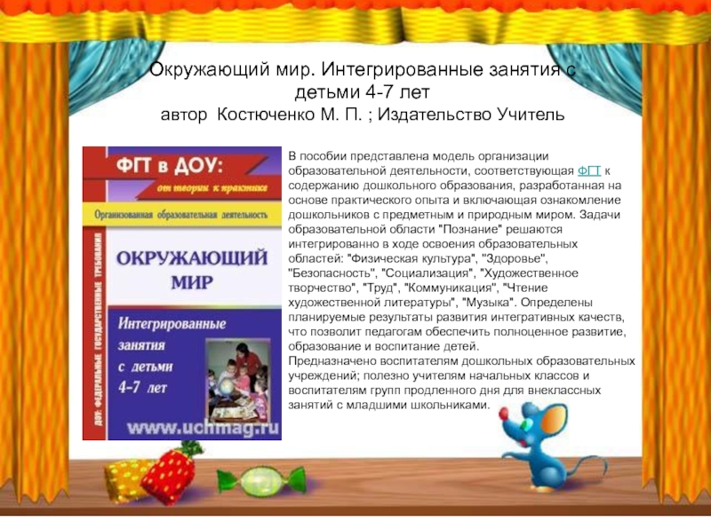 В пособии представлена модель организации образовательной деятельности, соответствующая ФГТ к содержанию дошкольного образования, разработанная на основе практического опыта и включающая ознакомление дошкольников с предметным и природным миром. Задачи образовательной области "Познание" решаются интегрированно в ходе освоения образовательных областей: "Физическая культура", "Здоровье", "Безопасность", "Социализация", "Художественное творчество", "Труд", "Коммуникация", "Чтение художественной литературы", "Музыка". Определены планируемые результаты развития интегративных качеств, что позволит педагогам обеспечить полноценное развитие, образование и воспитание детей.