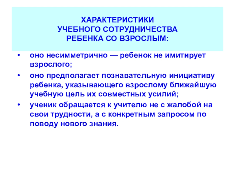 оно предполагает познавательную инициативу ребенка, указывающего взрослому ближайшую учебную цель их совместных усилий;