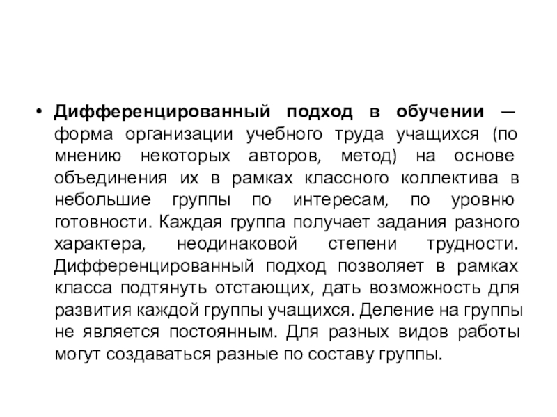 Слайд 10Дифференцированный подход в обучении — форма организации учебного труда учащихся (по