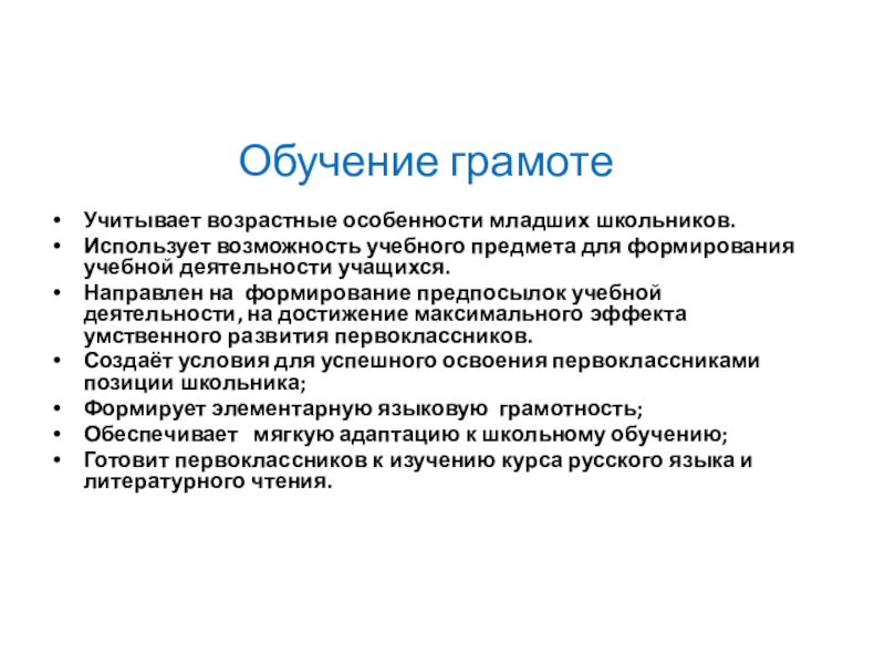 Готовит первоклассников к изучению курса русского языка и литературного чтения.