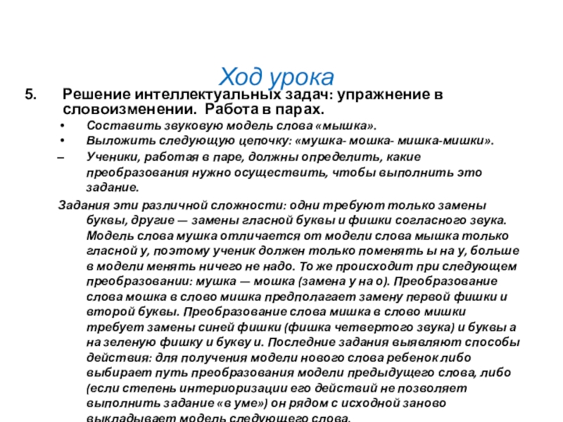 Задания эти различной сложности: одни требуют только замены буквы, другие — замены гласной буквы и фишки согласного звука. Модель слова мушка отличается от модели слова мышка только гласной у, поэтому ученик должен только поменять ы на у, больше в модели менять ничего не надо. То же происходит при следующем преобразовании: мушка — мошка (замена у на о). Преобразование слова мошка в слово мишка предполагает замену первой фишки и второй буквы. Преобразование слова мишка в слово мишки требует замены синей фишки (фишка четвертого звука) и буквы а на зеленую фишку и букву и. Последние задания выявляют способы действия: для получения модели нового слова ребенок либо выбирает путь преобразования модели предыдущего слова, либо (если степень интериоризации его действий не позволяет выполнить задание «в уме») он рядом с исходной заново выкладывает модель следующего слова.
