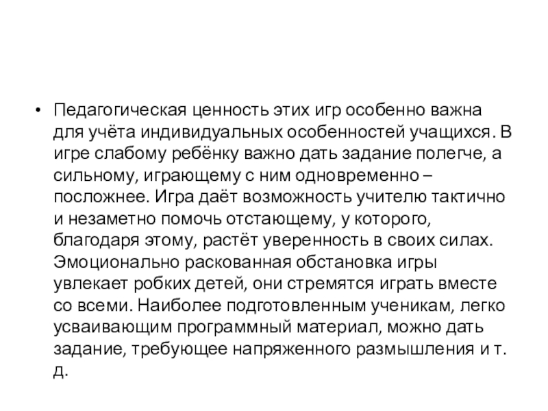 Слайд 13Педагогическая ценность этих игр особенно важна для учёта индивидуальных особенностей учащихся.