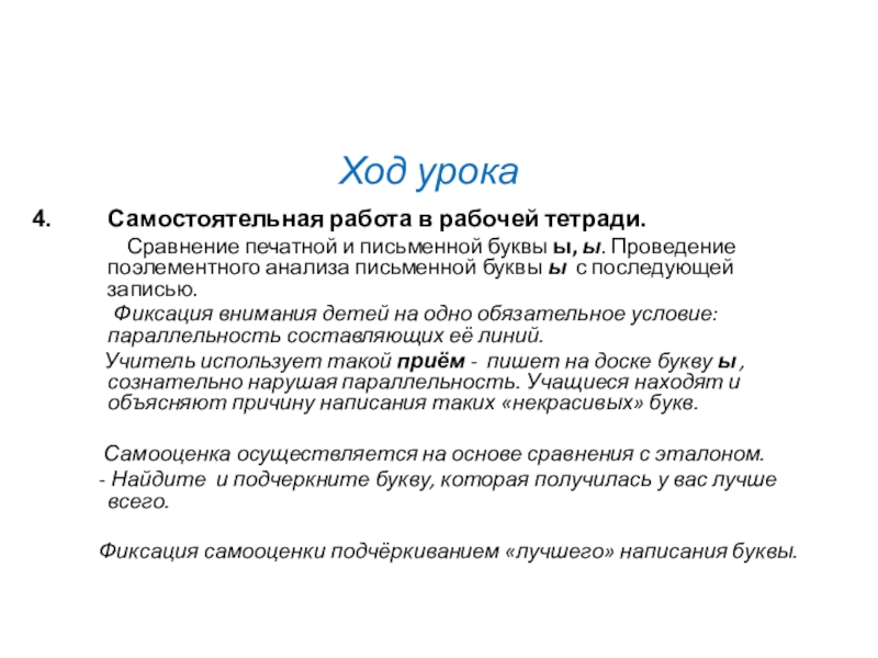 Учитель использует такой приём - пишет на доске букву ы , сознательно нарушая параллельность. Учащиеся находят и объясняют причину написания таких «некрасивых» букв.