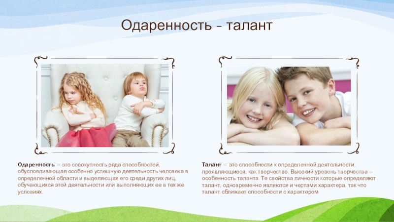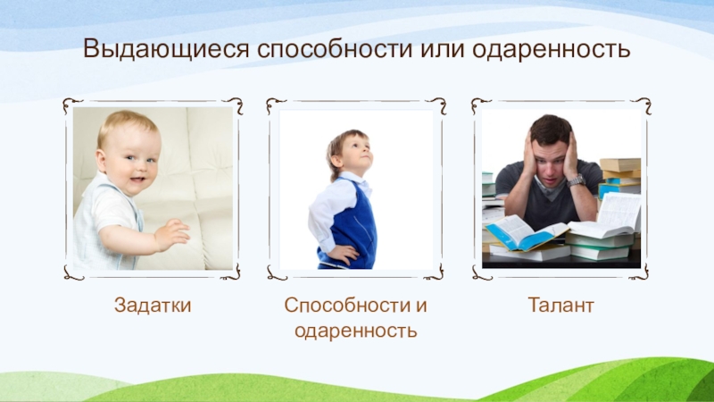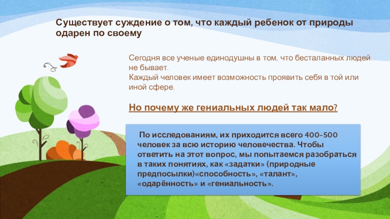 По исследованиям, их приходится всего 400-500 человек за всю историю человечества. Чтобы ответить на этот вопрос, мы попытаемся разобраться в таких понятиях, как «задатки» (природные предпосылки)«способность», «талант», «одарённость» и «гениальность».