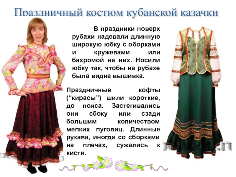 Праздничные кофты (“кирасы”) шили короткие, до пояса. Застегивались они сбоку или сзади большим количеством мелких пуговиц. Длинные рукава, иногда со сборками на плечах, сужались к кисти.