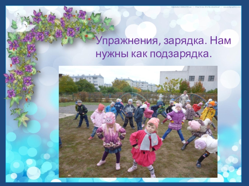 Слайд 4Упражнения, зарядка. Нам нужны как подзарядка.