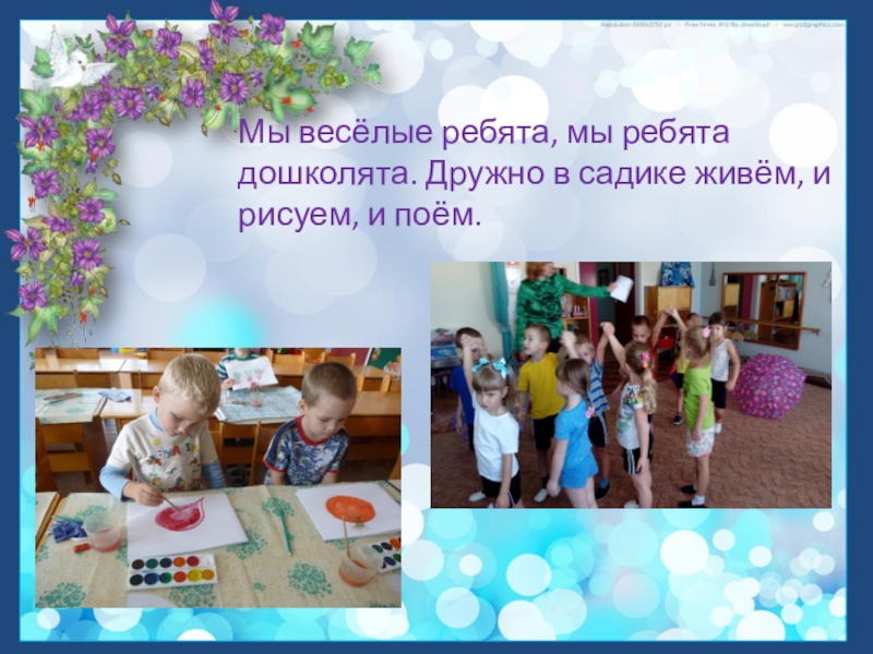 Мы весёлые ребята, мы ребята дошколята. Дружно в садике живём, и рисуем, и поём.