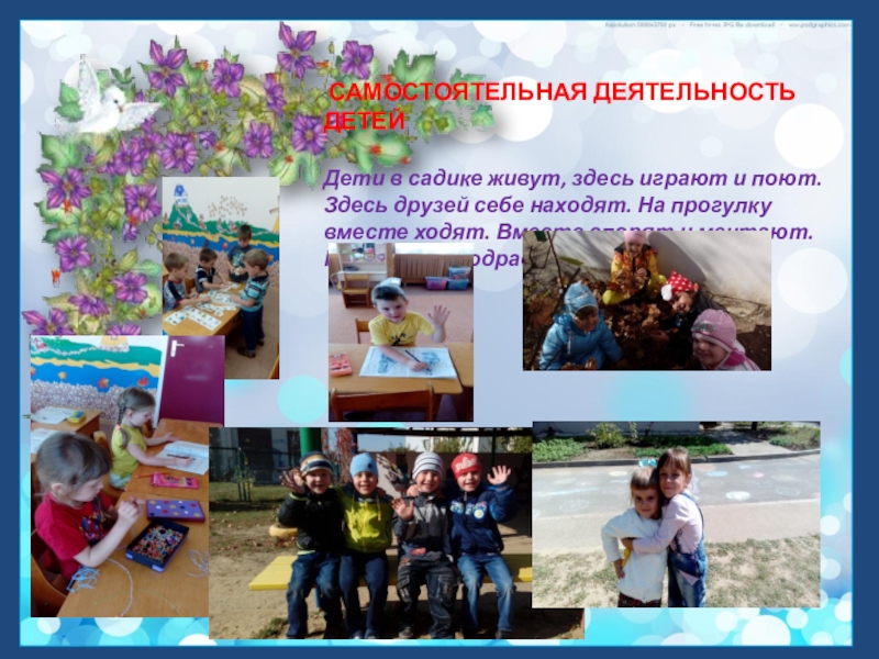 САМОСТОЯТЕЛЬНАЯ ДЕЯТЕЛЬНОСТЬ ДЕТЕЙ Дети в садике живут, здесь играют и поют. Здесь друзей себе находят. На
