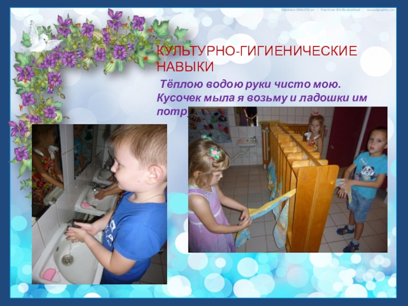 КУЛЬТУРНО-ГИГИЕНИЧЕСКИЕ НАВЫКИ Тёплою водою руки чисто мою. Кусочек мыла я возьму и ладошки им потру.