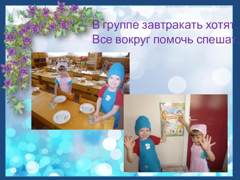 Слайд 5В группе завтракать хотят. Все вокруг помочь спешат.