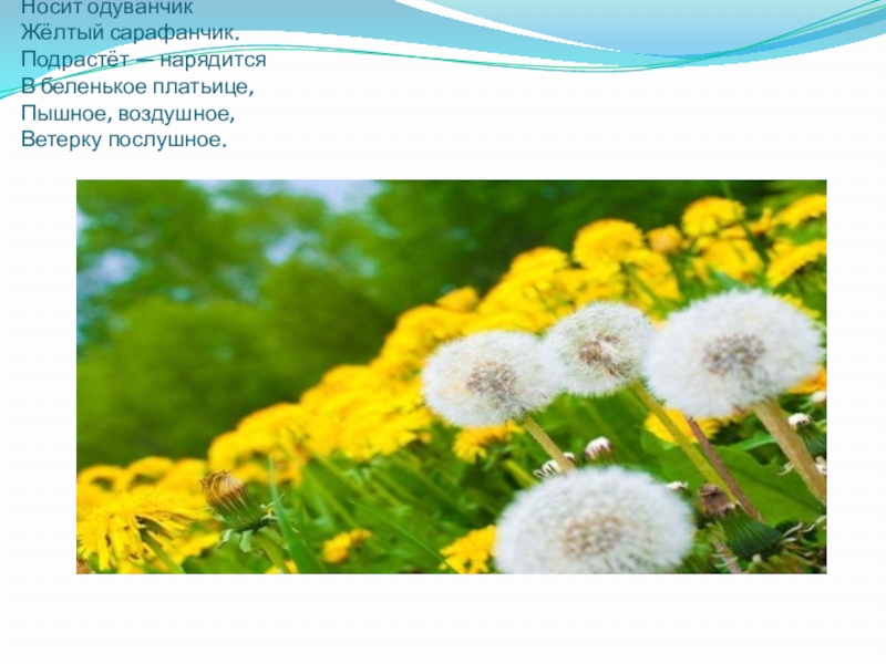 Слайд 3Носит одуванчик Жёлтый сарафанчик. Подрастёт — нарядится В беленькое платьице, Пышное, воздушное, Ветерку послушное.